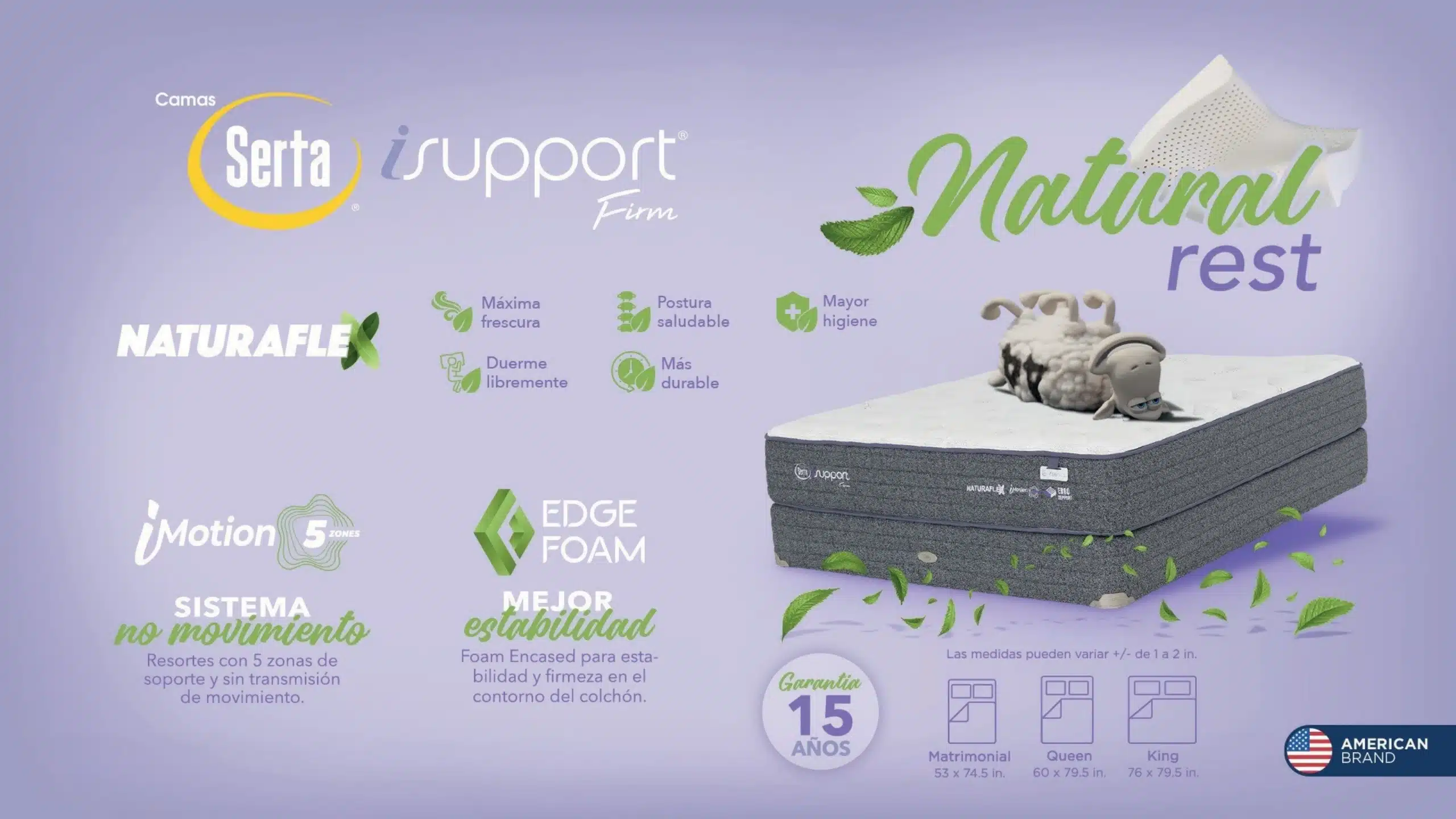 | Tamaño (Americana) | Full (135 x 190 cm), Queen (152 x 200 cm), King Size (193 x 200 cm) |