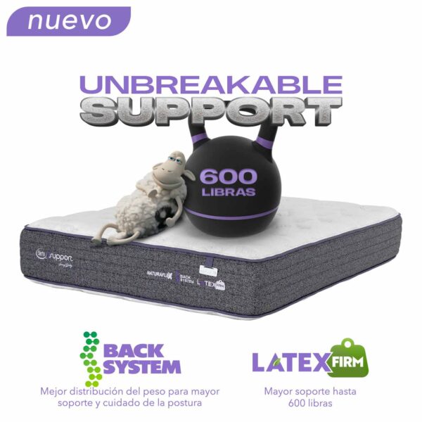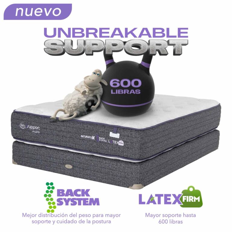 Soporte Firme, Durabilidad e Higiene, sistema Latex Support que estabiliza la postura del cuerpo al descansar, evitando deformaciones del colchón y reduciendo la acumulación de ácaros.