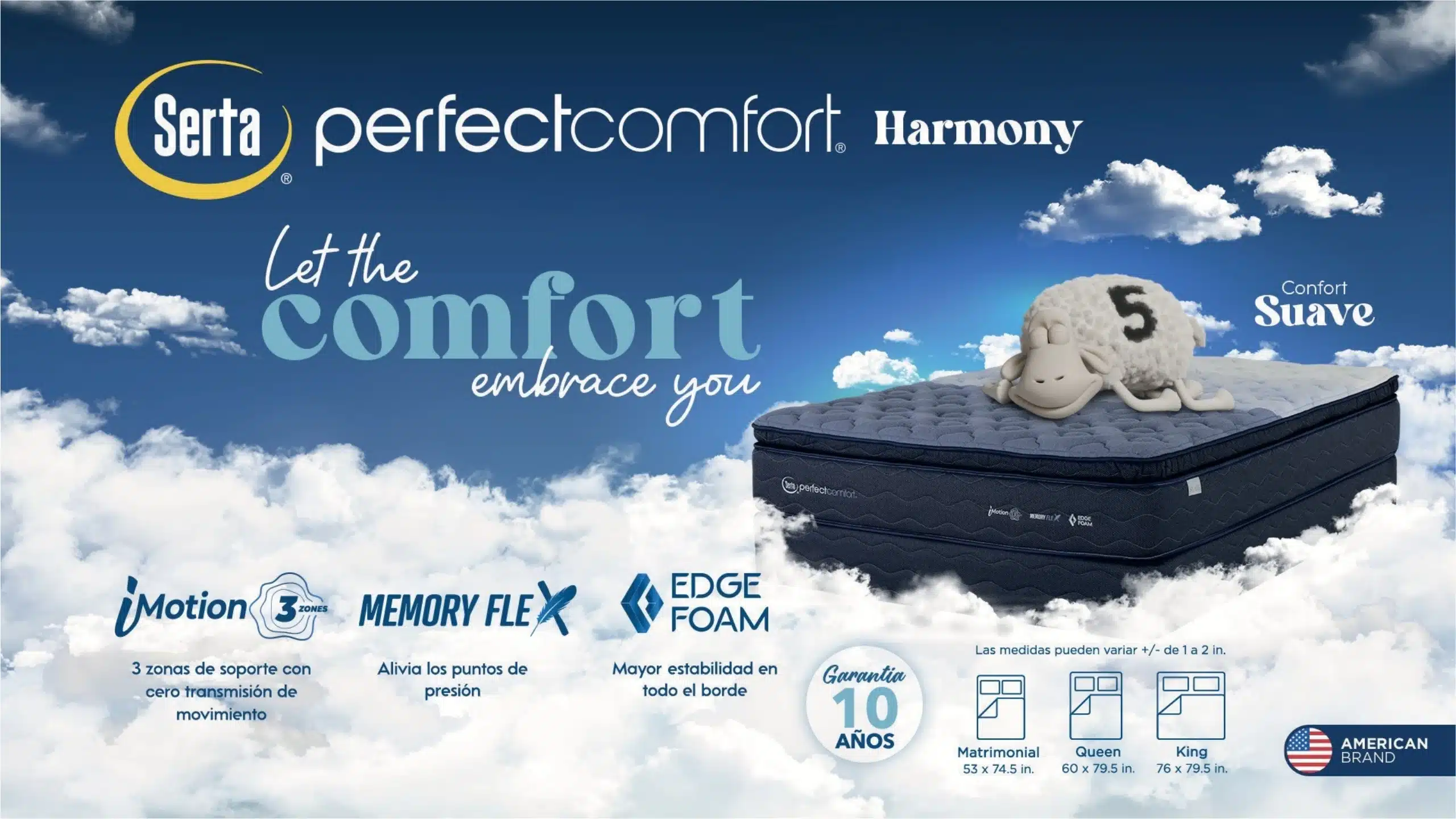 | Tamaño (Americana) | Full (135 x 190 cm), Queen (152 x 200 cm), King Size (193 x 200 cm) |