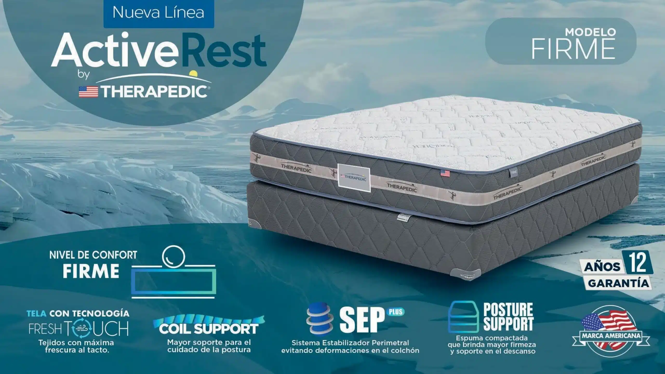 Descubre el equilibrio perfecto entre soporte y comodidad con la nueva línea ActiveRest de Therapedic, marca americana reconocida por su calidad y durabilidad. El Modelo Firme está diseñado para ofrecer un descanso reparador gracias a sus innovadoras tecnologías y materiales de alta gama.
