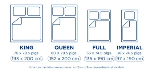 | Tamaño (Americana) | Full (135 x 190 cm), Queen (152 x 200 cm), King Size (193 x 200 cm) |
