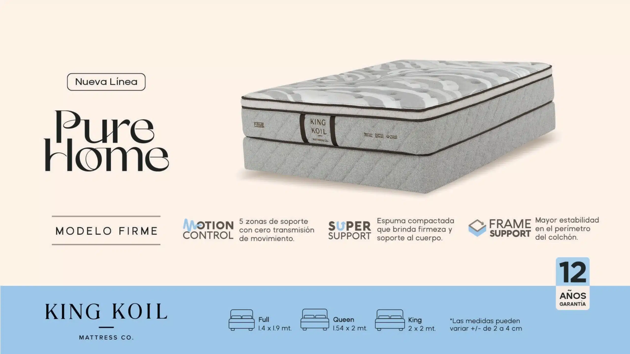 El colchón ortopédico King Koil Pure Home Firme ofrece la combinación perfecta de tecnología americana y confort premium para un descanso profundo y reparador. Con su sistema Motion Control de 5 zonas de soporte, elimina la transmisión de movimiento, ideal para parejas que buscan independencia al dormir.